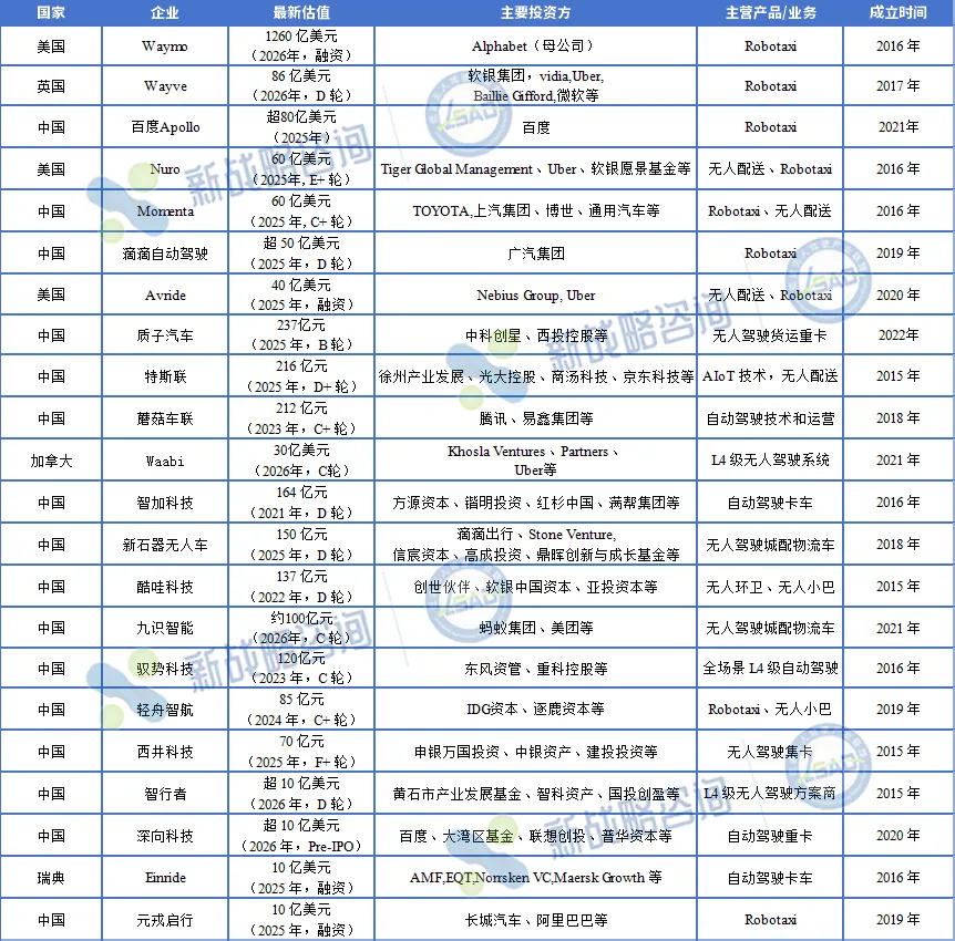 其中,美国自动驾驶出租车公司Waymo一骑绝尘,随着在2026年2月初完成高达160亿美元融资,公司投后估值达到1260亿美元(约合人民币8753亿元),较其2024年10月的450亿美元估值翻倍有余,一举成为自动驾驶最贵独角兽。英国的Wayve以86亿美元估值位列“榜眼”,其凭借端到端AI驾驶模型快速崛起,成为欧洲标杆代表。中国的百度Apollo以估值超80亿美元紧随其后。从估值分布看,千亿美元级仅Waymo一家,估值断层领先,多数企业集中在数十亿美元级区间,包括Wayve、百度Apollo、Momenta、Nuro、新石器无人车等,反映出资本向技术成熟度高、商业化路径清晰的企业集中。从区域分布来看,全球市场呈现出由中美双强主导、欧洲快速跟进的局面。美国凭借Waymo的绝对领先地位,在估值总量上占据优势。除Waymo外,Nuro、Avride、Waabi等企业也在无人配送与L4系统领域持续发力。中国企业数量最多,占据了16席,新石器无人车、酷哇科技、九识智能、西井科技、驭势科技、轻舟智航等企业总估值超335亿美元。覆盖Robotaxi、无人配送、干线物流、无人环卫等多个场景,生态最为完整。欧洲则以英国的Wayve、瑞典的Einride为代表,凭借创新技术及方案,在Robotaxi、自动驾驶卡车领域占据一席之地。从所属领域来看,Robotaxi仍是资本最聚集的赛道,估值前三的Waymo、Wayve、百度Apollo均以此为主攻方向,并且,在所录得的22家企业中,涉及Robotaxi业务的企业超10家;无人配送同样是资本看好的重要领域,Nuro、新石器无人车、九识智能等企业专注城配物流,商业模式逐渐清晰。深向科技、智加科技、Einride等企业则瞄准干线物流,通过降低人力成本、提升运输效率实现商业闭环。此外,在无人环卫、无人港口、无人接驳等多元垂直场景,酷哇科技、西井科技、轻舟智航等深入特定行业,形成差异化竞争优势。