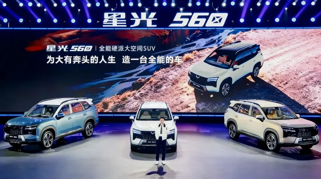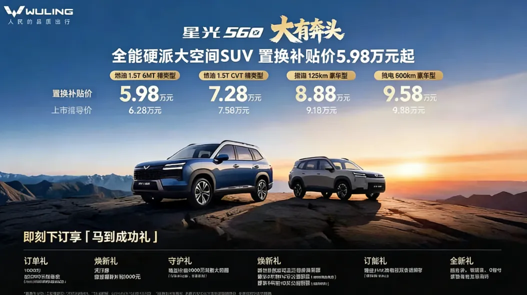 1月15日,五菱星光560正式上市,置换补贴后5.98万-9.58万元的价格区间,直接把硬派风格SUV的入手门槛拉到了一个新低点。更值得关注的是,它同时提供燃油、插混、纯电三套动力总成——这在6万级市场里,确实少见。