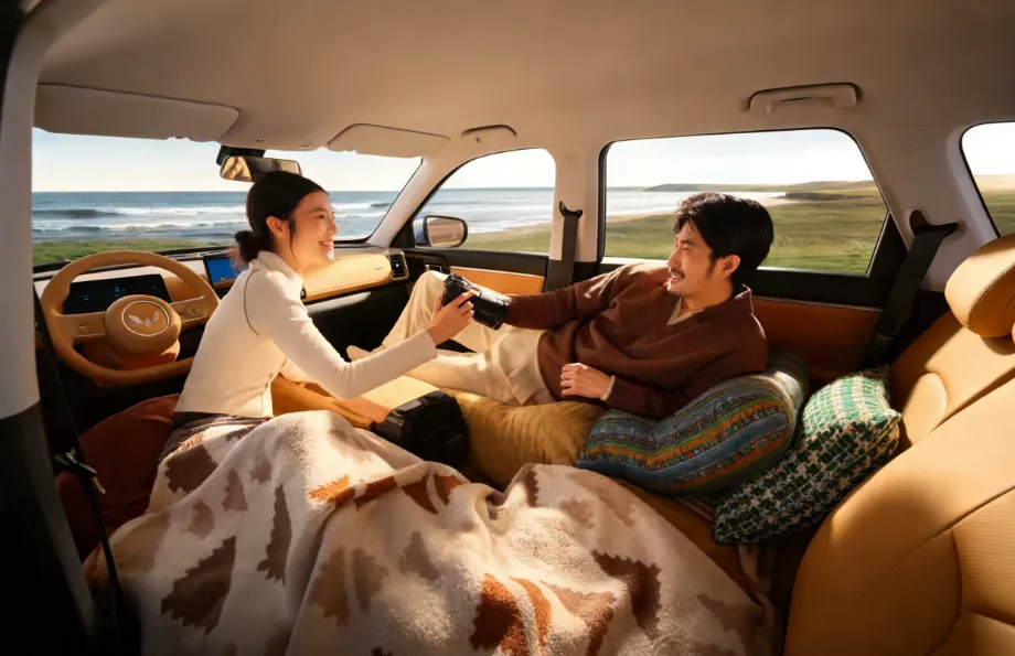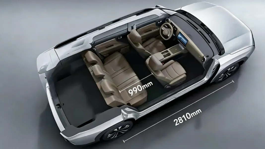 先说空间,因为这才是它真正的核心竞争力。2810mm的轴距,在同级别里普遍只有2700mm左右的背景下,优势相当直观。官方给出的“得房率”数据是83%,实际体验下来,后排纯平地台、990mm的座间距,坐三个成年人不会觉得局促。后备箱常规763L,后排放倒后可扩展到1945L,对于多口之家或者有装载需求的用户来说,这个数字很有说服力。