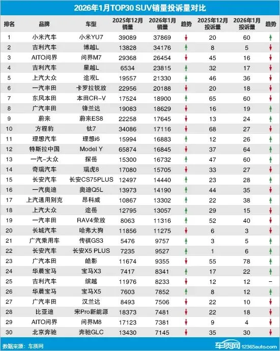 据乘联会提供的全国汽车产销数据显示,2026年1月国内SUV市场累计零售销量84.3万辆,环比下降28.4%,同比下降5.2%。同期,车质网受理车主针对SUV的有效投诉6,340宗,环比下降12.5%,同比上涨17.3%。去除投诉人自愿申请撤诉的信息后,2026年1月TOP30 SUV销量投诉量排名如下: