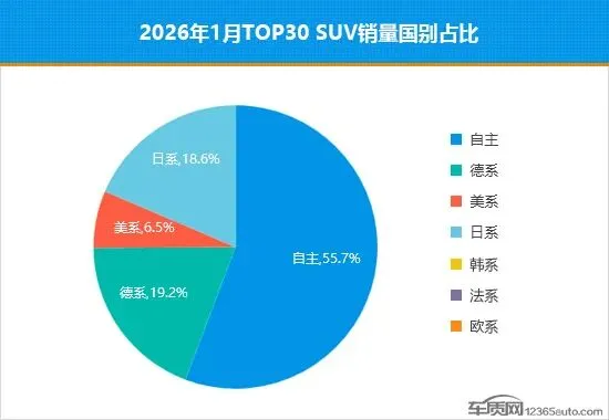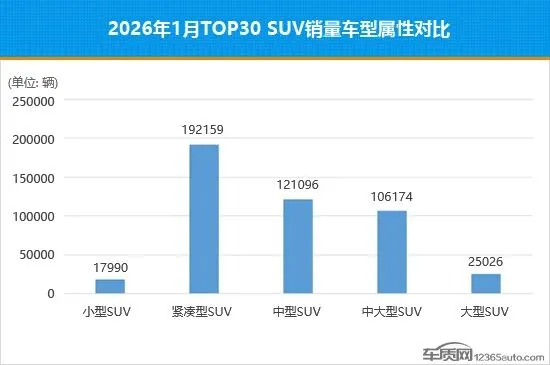 1月,紧凑型SUV与大型SUV销量实现逆势增长,特别是大型SUV,表现尤为突出,销量再度突破2万辆大关,环比增幅达46.2%。同期,小型SUV、中型SUV和中大型SUV销量环比均出现下滑,其中小型SUV降幅最大,较2025年12月下降41.5%,已跌至近半年最低点。
