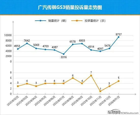 尽管受到新能源车型持续冲击,传祺GS3仍凭借不断迭代升级实现产品力稳步提升,已连续3年实现销量正增长,在燃油小型SUV细分市场中表现尤为难得。进入2026年,传祺GS3开年首月即迎来了高光时刻,1月销量环比上涨78.2%,达到历史第二高位。更值得关注的是其口碑情况,作为已上市8年多的老将,传祺GS3近一年的月投诉量均保持在个位数,出色的口碑值得肯定。从其本月的投诉销量比数值来看,与2025年12月相比略有升高,但依旧保持在个位数水平,表现日趋稳健。伴随着2026款车型逐步投放市场,依托扎实的口碑优势,传祺GS3的销量有望持续走高,再度突破万辆大关指日可待。