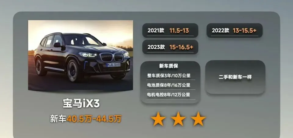 宝马iX3属于那种你看一眼就心动的:品牌、体面、价格还真不贵。可你要清楚它的底子:油改电励磁电机。再加上现实体验:智能化方面对比国产没法比,而且保险方面很贵,不过现在价格便宜。