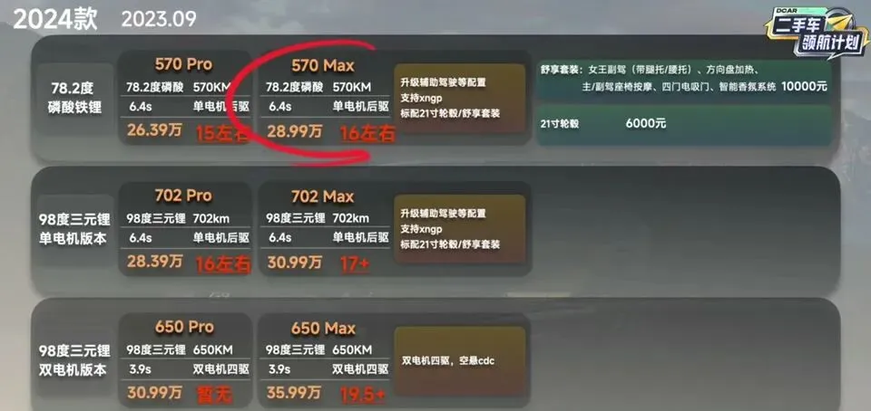 再看24款的变化:音响全系改成小鹏的自研音响,还有就是空悬变成了一个2万元的选装包,除了顶配其他版本都可以选配,所有的车型也都进行了降价,最低配变成了570