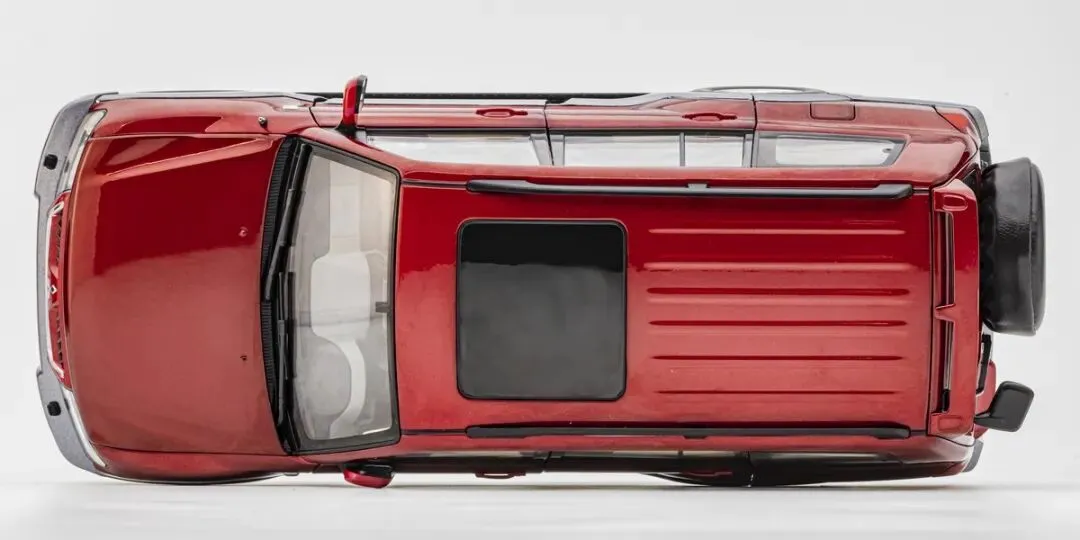 后盖为侧开合页设计,开启角度非常大,后盖内侧的细节也有所刻画,行李舱有植绒.模型的第三排座椅为可拆卸结构,取走第三排座椅后,行李舱的地板可以掀开,里面有灭火筒和工具细节。模型的第三排座椅为磁铁吸附的独立分件,而且同样可以折叠起来。