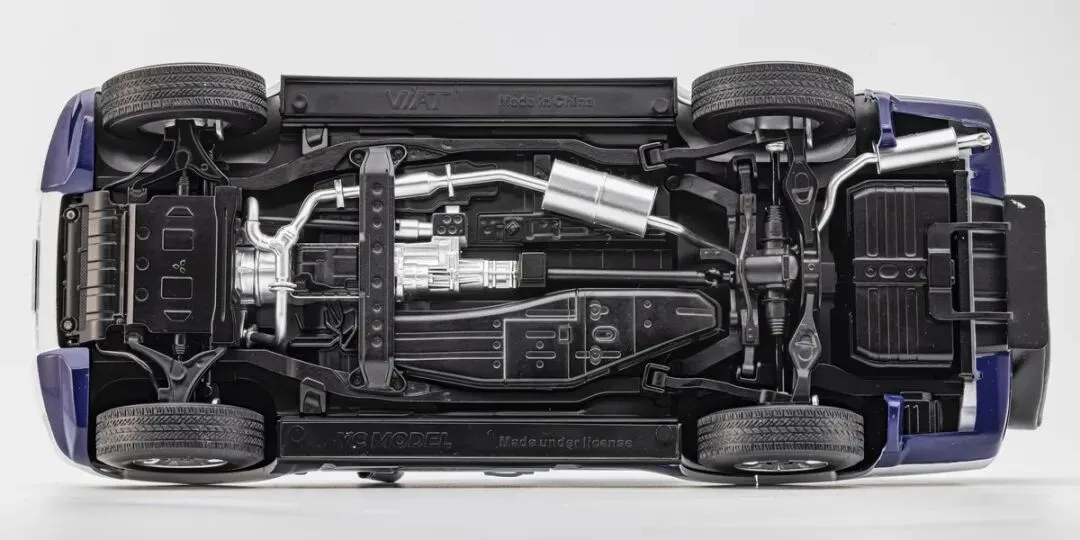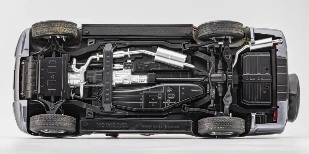 模型的底盘做了弹簧悬挂功能,细节方面分件比较多,包括转向结构、悬挂结构、传动结构等都做了分件,排气系统还租了电镀分色。模型的后轮还做了轴联动;整体上看YC的这款V73底盘细节还算丰富,这也是越野车模型的特点之一。