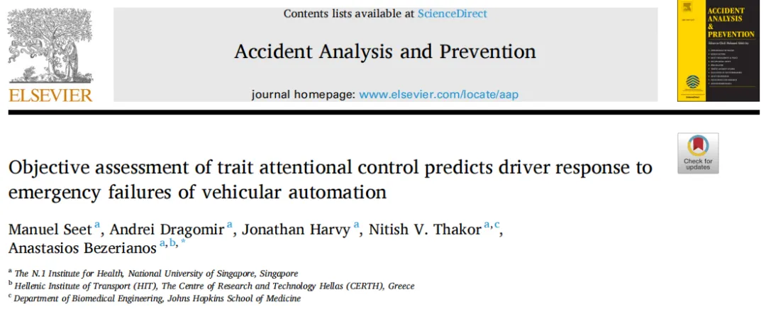 在此背景下,新加坡国立大学研究者在国际交通安全权威期刊Accident Analysis & Prevention(IF=6.2)发表题为“Objective assessment of trait attentional control predicts driver response to emergency failures of vehicular automation”的研究论文。研究旨在检验基线状态下的EEG频谱比值是否能够预测驾驶者在自动驾驶静默失效情境中的接管反应时间及事故风险,并进一步评估该神经指标在可穿戴简化电极条件下的应用可行性。