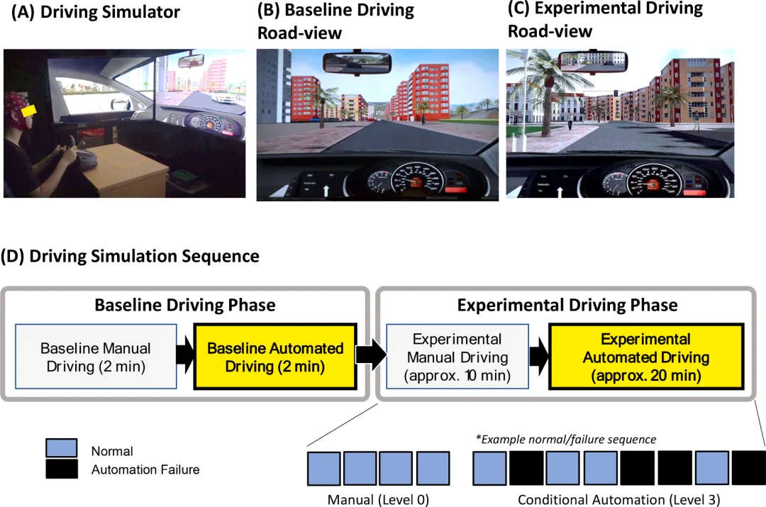 研究共招募29名健康成人参与实验,其中男性21人、女性8人,平均年龄为23.6岁。所有被试均持有有效驾驶执照,但此前未接触过自动驾驶车辆。本研究在高保真驾驶模拟器环境中开展实验,整体驾驶任务为连续不间断的行驶过程,分为基线阶段与实验阶段两个部分。基线阶段持续4分钟,其中前2分钟为手动驾驶(L0),后2分钟为条件自动驾驶(L3),研究者选取基线自动驾驶阶段的脑电数据作为特质性神经指标的估计窗口。实验阶段首先进行短暂手动驾驶熟悉情境,随后进入自动驾驶情境,共包含8个路口事件,其中4个为正常自动减速情境,4个为静默失效情境。在静默失效条件下,自动驾驶系统未执行应有减速操作且未发出接管请求,驾驶者需自行察觉异常并按下接管按钮完成接管。研究记录接管反应时间、制动反应时间及是否发生碰撞等行为指标。