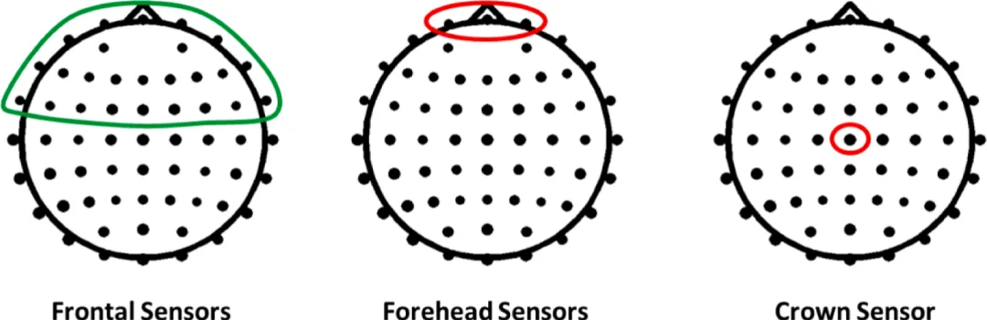 图3 三种电极选择方案(A)额区电极;(B)额头三电极;(C)头顶单电极