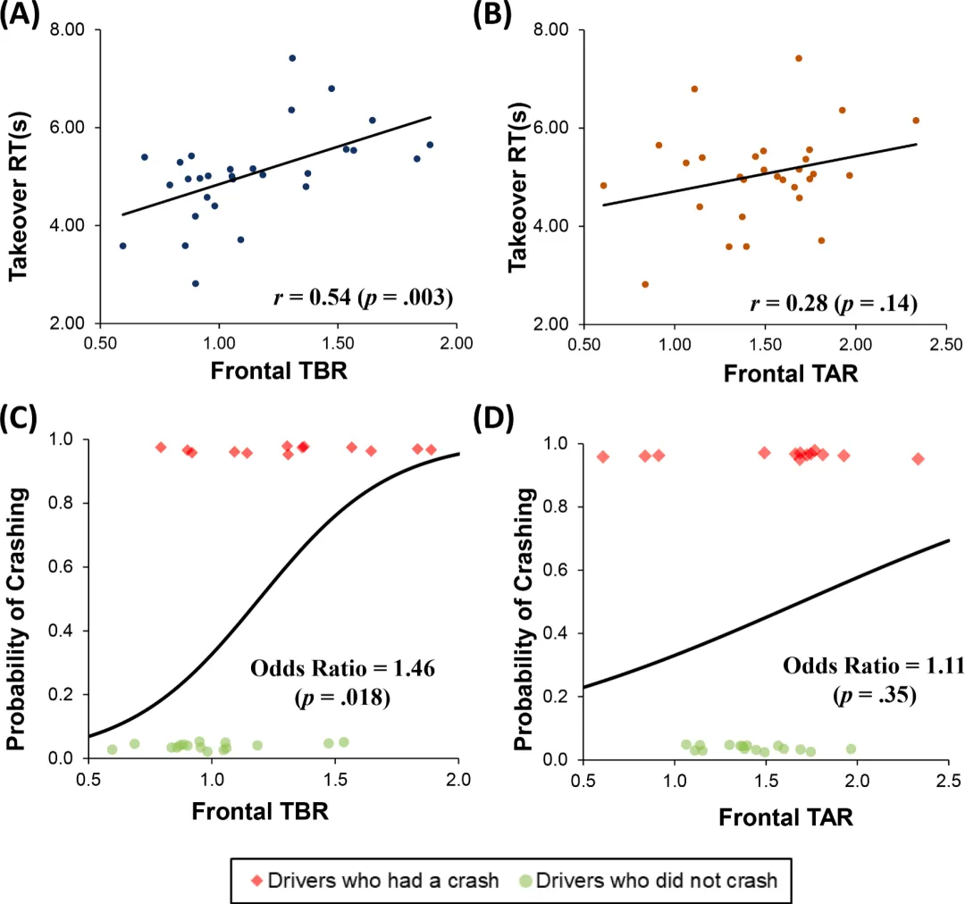 结果显示,基线阶段额区TBR与平均接管反应时间显著正相关,即TBR越高,接管反应时间越长。线性回归分析进一步表明,TBR能够显著解释接管反应时间的方差,并且在控制失效诱发主观压力与驾驶经验后仍保持显著预测作用。相比之下,TAR与接管反应时间之间未呈现显著关系。在事故风险方面,逻辑回归分析显示,较高的TBR显著提高发生碰撞的概率。具体而言,TBR每增加0.1单位,碰撞风险的优势比(odds ratio)显著上升,且在控制驾驶经验后仍保持显著。TAR同样未表现出显著预测效应。