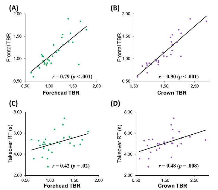 在可穿戴验证分析中,额头三电极与头顶单电极计算得到的TBR与标准额区TBR高度相关,并同样能够显著预测接管反应时间与事故概率。其中,头顶单电极(Cz)的预测效度与额区平均结果高度一致,表明该指标在极简电极条件下仍具有较好应用潜力。