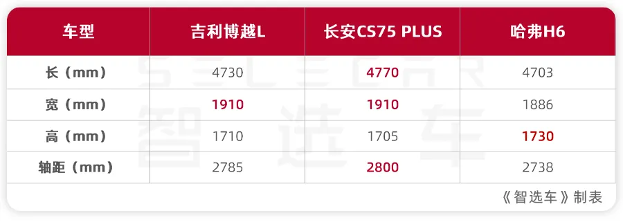 从车身尺寸来看,长安CS75 PLUS是三款车中长度和轴距最长的,吉利博越L的宽度与CS75 PLUS持平,哈弗H6的高度要略占优势。
