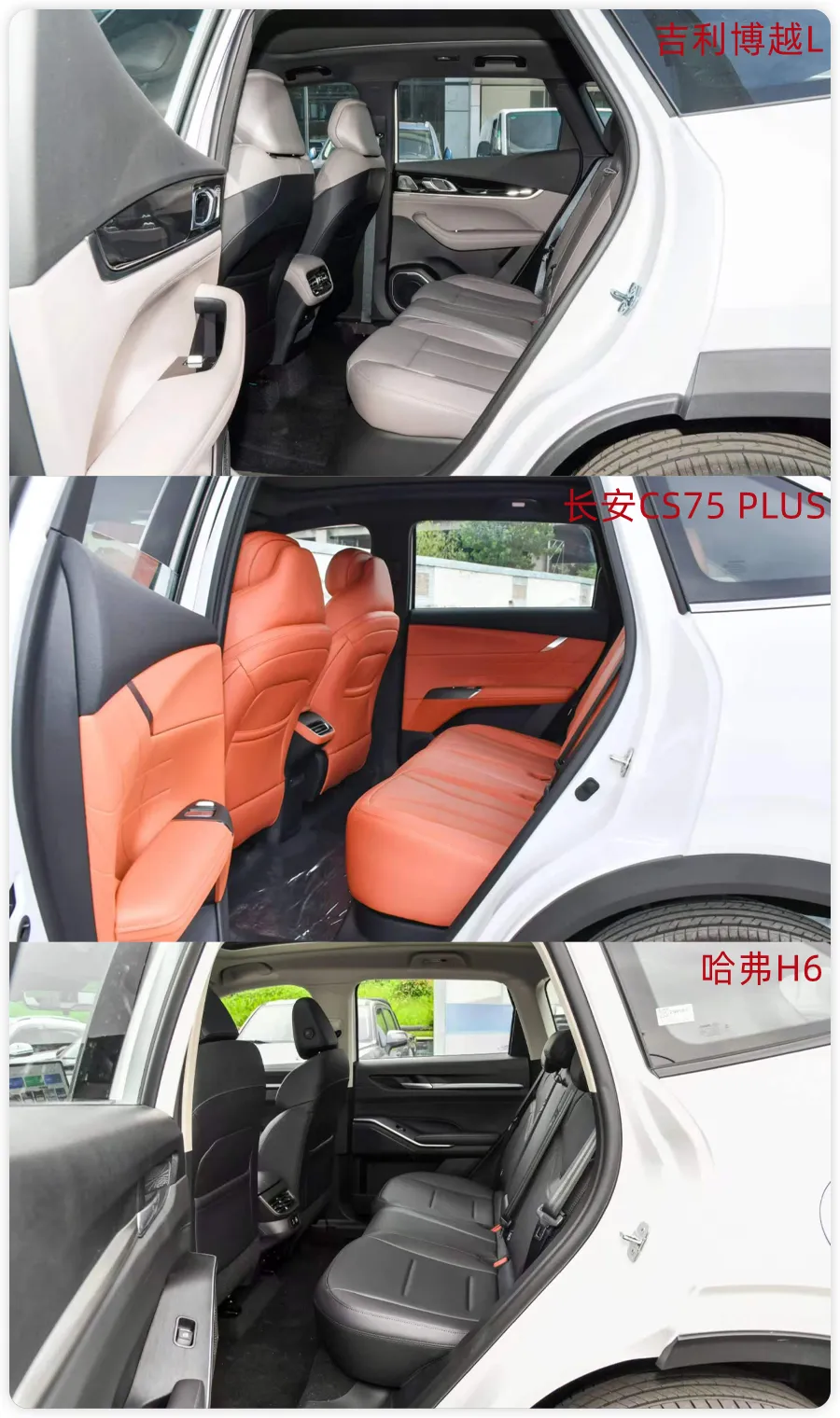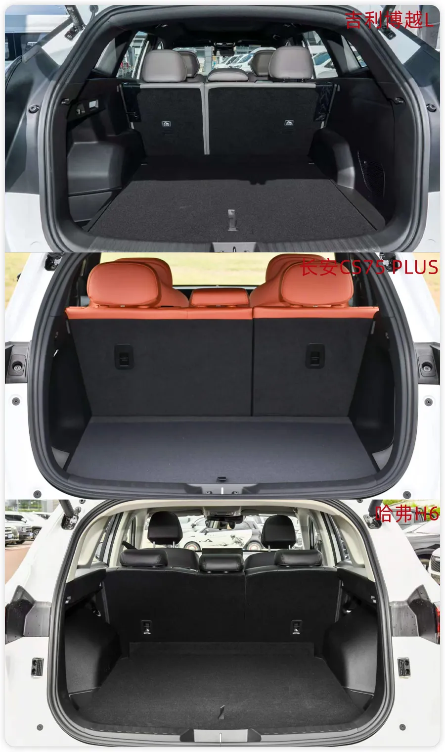后备厢表现上,博越L常规容积650L,下沉式设计能扩展到1910mm纵深,放婴儿车、行李箱毫无压力;长安CS75 PLUS后备厢容积610-1620L,拓展能力也不错;哈弗H6后备厢常规容积稍小,但日常放杂物、购物袋也足够用,只是纵深不如前两款车。
