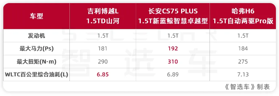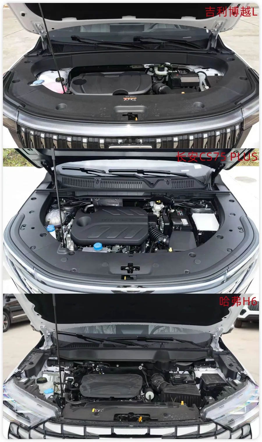 吉利博越L和哈弗H6都匹配7速湿式双离合变速箱,长安CS75 PLUS则是爱信8AT变速箱。
