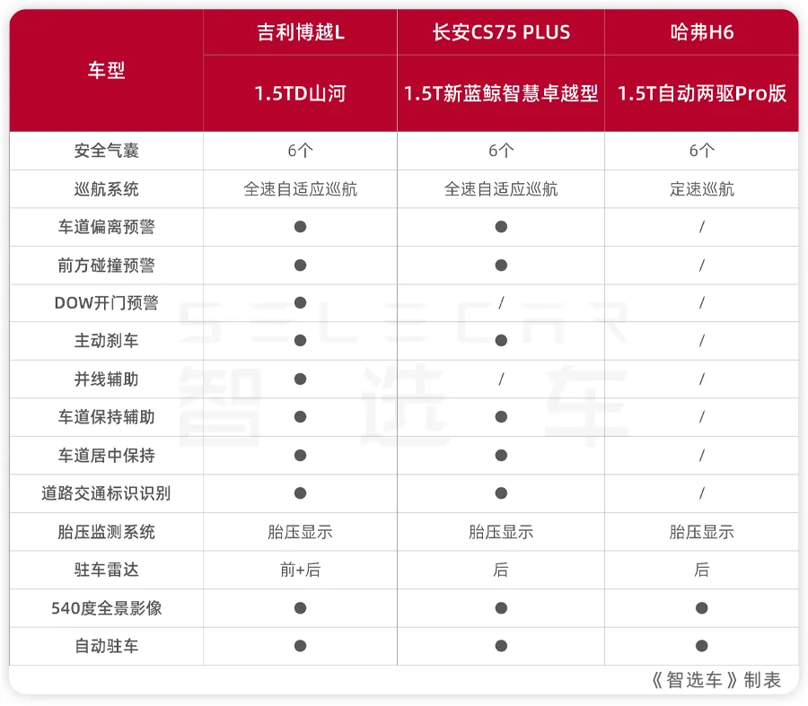 长安CS75 PLUS像比较实用的前方碰撞预警、主动刹车、车道保持辅助等主动安全功能都有,可以覆盖常用场景,但功能数量不如博越L。哈弗H6的主动安全功能较少,适合以通勤代步为主,对辅助驾驶需求不高的用户。