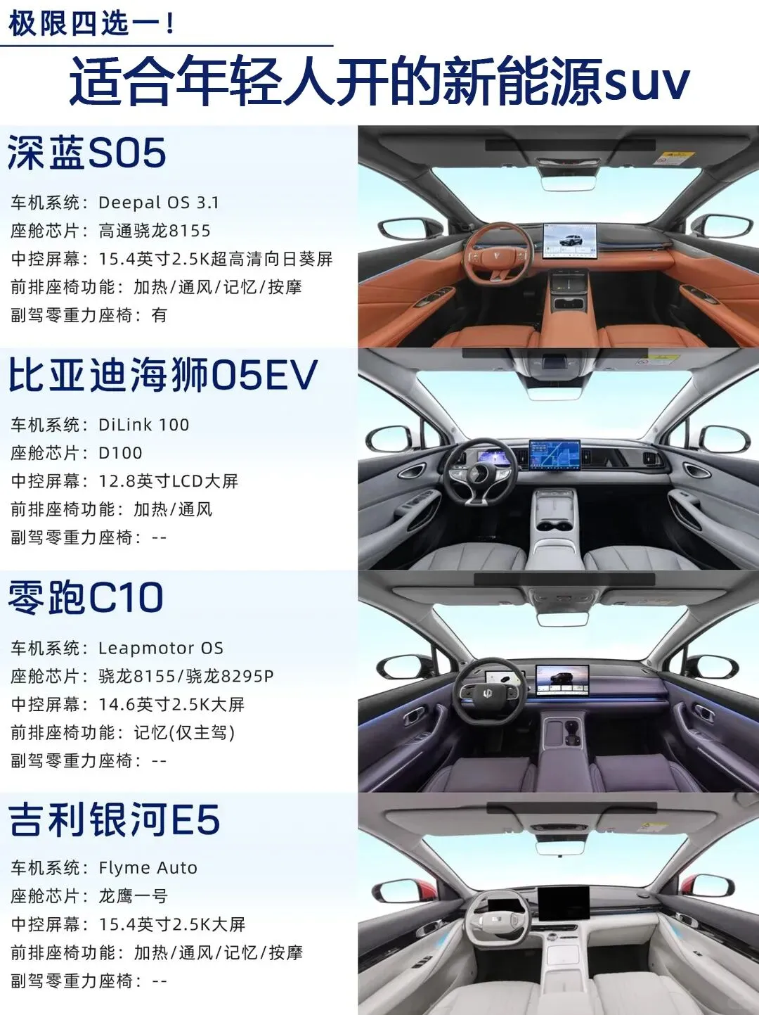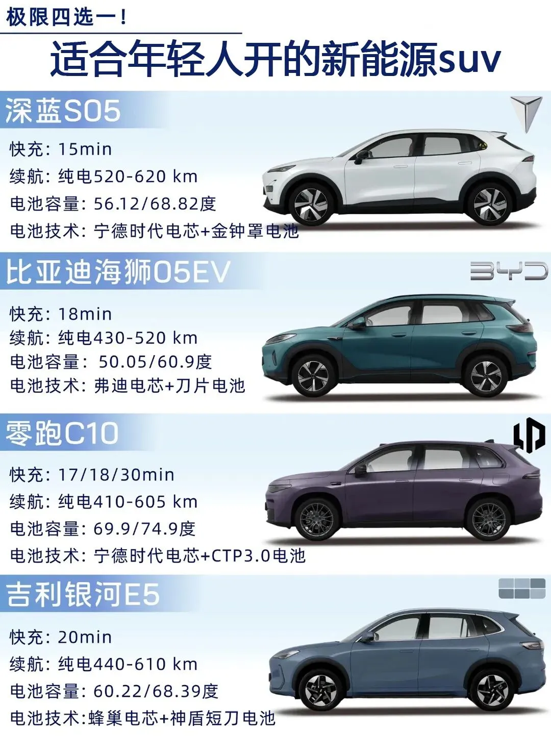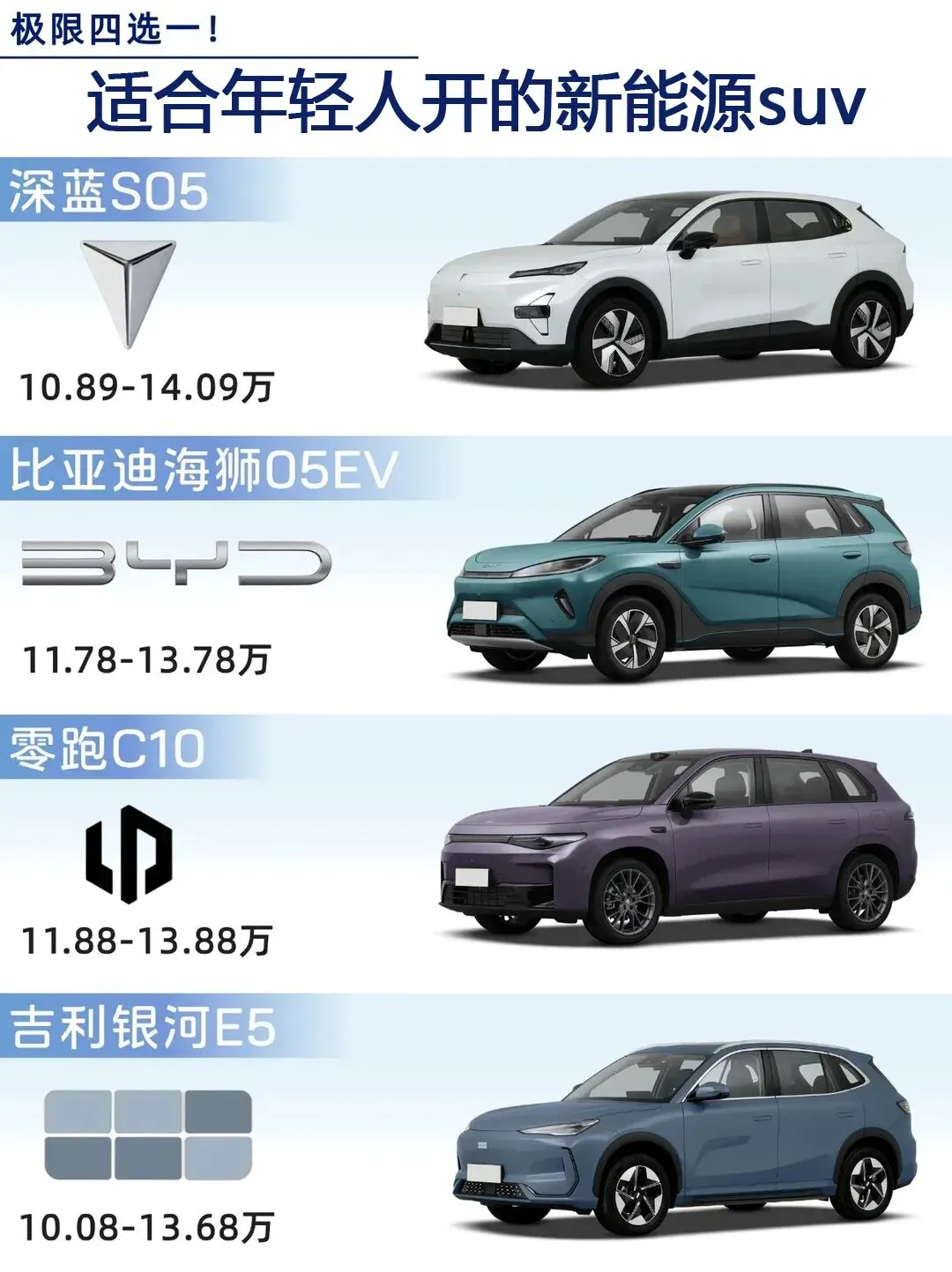 买车没有最好,只有更适合,🔺追求性价比、无续航焦虑、空间大、补能快就选深蓝S05,🔺银河E5的安全性不错,🔺海狮05EV颜值高,🔺看重智能座舱和智能辅助驾驶以及800V高压快充,且预算充足选零跑C10