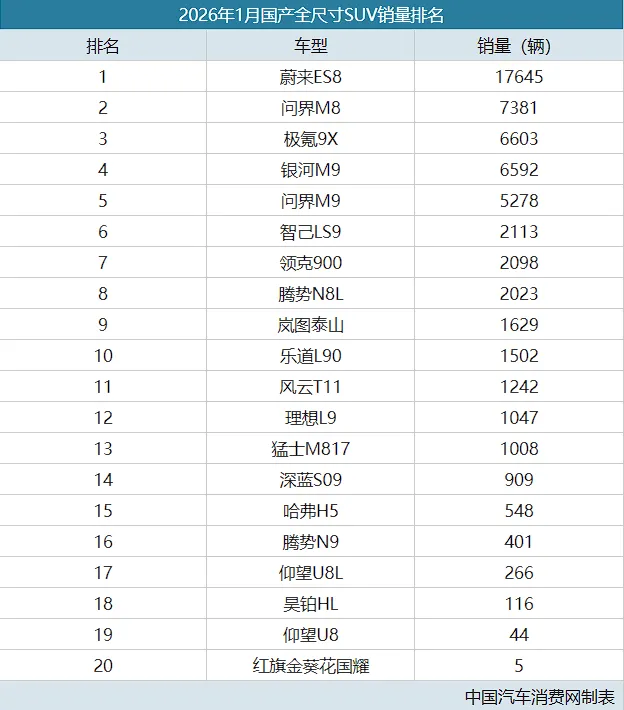 受绿牌车征收购置税影响,国产绿牌全尺寸SUV销量整体低走,不过手握大量订单的蔚来ES8依旧强势,以17645台的月销表现遥遥领先于其它选手,强势拿下国产全尺寸SUV月销冠军,它也是榜单里唯一月销破万的选手。