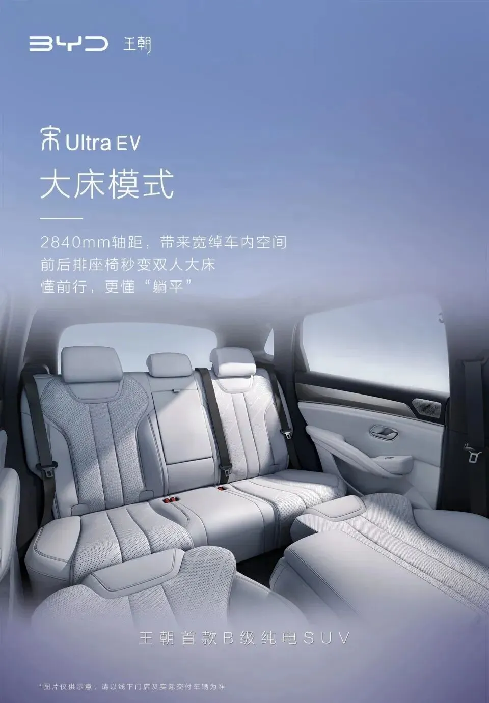 新车中央扶手处配有双手机无线充电板(预计可提供 50W 无线充电功率)、置物杯架等,并设置有物理按键和旋钮。宋 Ultra EV 的轴距为 2840mm,支持前排座椅放倒,宣称“前后排座椅秒变双人大床”。