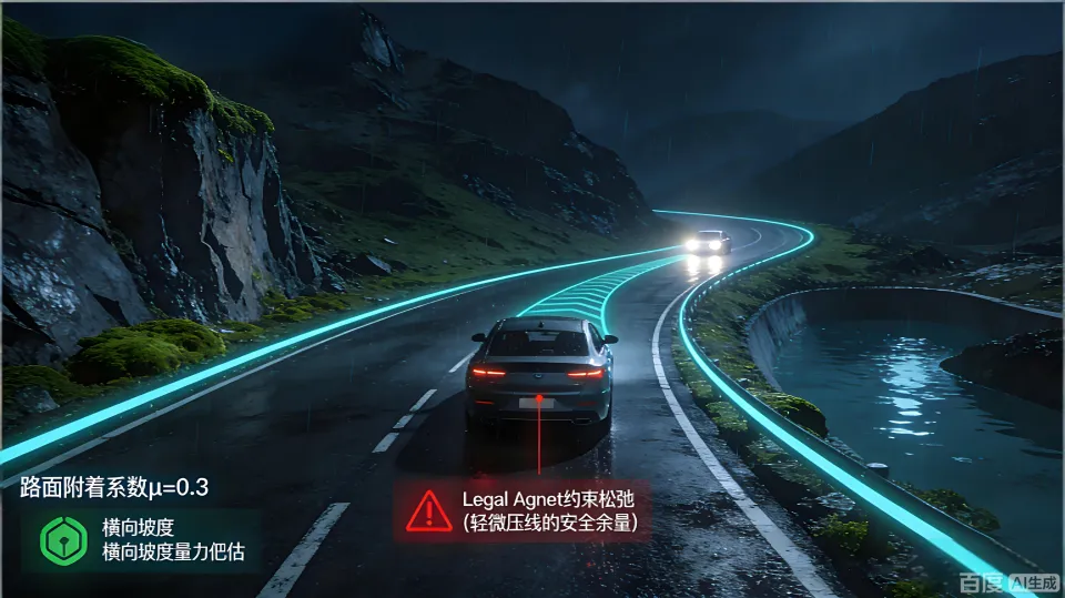和 30km/h。这意味着即使传感器感知模糊,物理引擎也会给出一个“物理硬约束”:在这个曲率和摩擦力下,速度超过 X 必滑出路面。这为AI划定了绝对的安全红线。