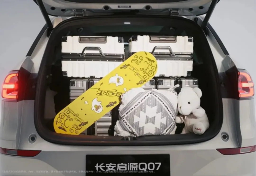 价格再往下探,长安启源Q07和零跑C16都卡在17万出头的位置,各有各的打法。启源Q07车长4837mm、轴距2905mm,大五座布局下车内纵深做到了3180mm,空间利用率86%,后备厢不放倒座椅就能塞12个20寸行李箱,装载能力是真的能打。