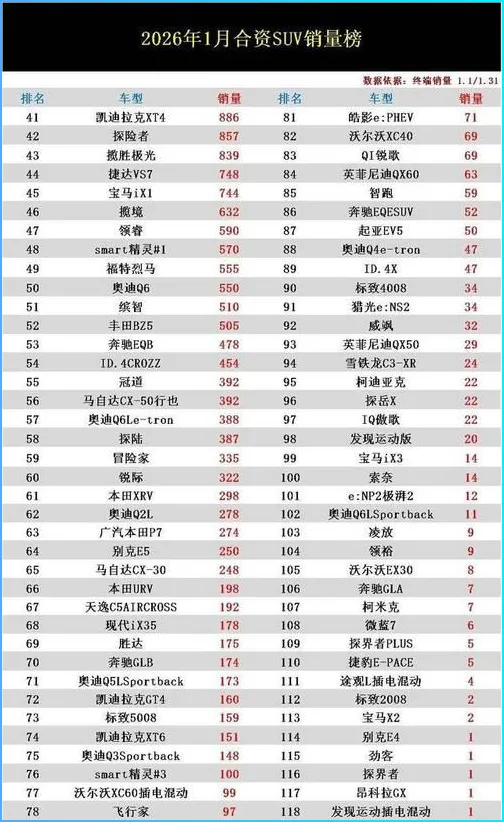 哥们儿姐们儿大家好,今天咱们不聊具体车型了,聊聊最近看到的一个数据,就是1月份合资SUV的销量排行榜。说实话,看完之后我心里挺不是滋味的,这个市场真的是,怎么说呢.
