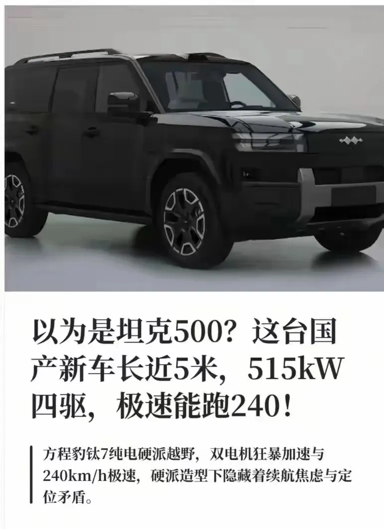 方程豹的钛7混动版已经上市,指导价17.98-21.98万。这款车定位“家用硬派”,外观是方盒子造型,很硬朗。纯电版已在工信部申报,纯电续航或超750km.