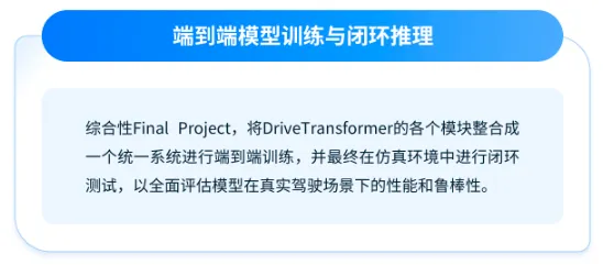 因此,深蓝学院开设了《端到端自动驾驶理论与实践》课程,通过4个递进式实践项目(涵盖动态/静态感知、规控决策、端到端训练与闭环推理),帮助学员构建完整知识体系,实现从模块化到端到端系统思维的升级,全面培养自动驾驶工程实践能力。以下是课程项目介绍: