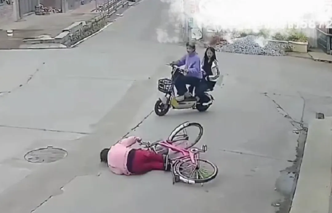 短短几秒钟后,前方的骑车老妇突然重心不稳,重重摔倒在马路上。