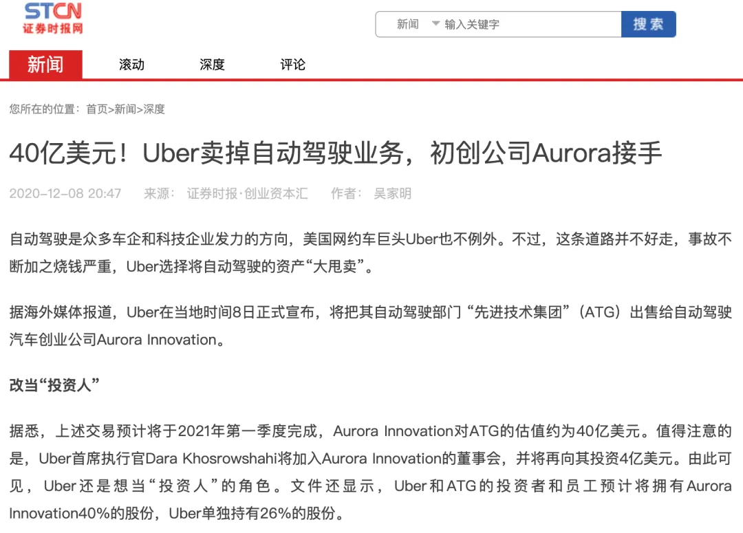 2020年12月,Uber宣布将旗下自动驾驶部门ATG出售给初创公司Aurora,交易对ATG的估值约为40亿美元,较2019年丰田、软银、电装等入股时的72.5亿美元估值大幅缩水45%。Uber不仅卖掉了这个倾注五年心血的部门,还向Aurora投资4亿美元,换取后者26%的股权。
