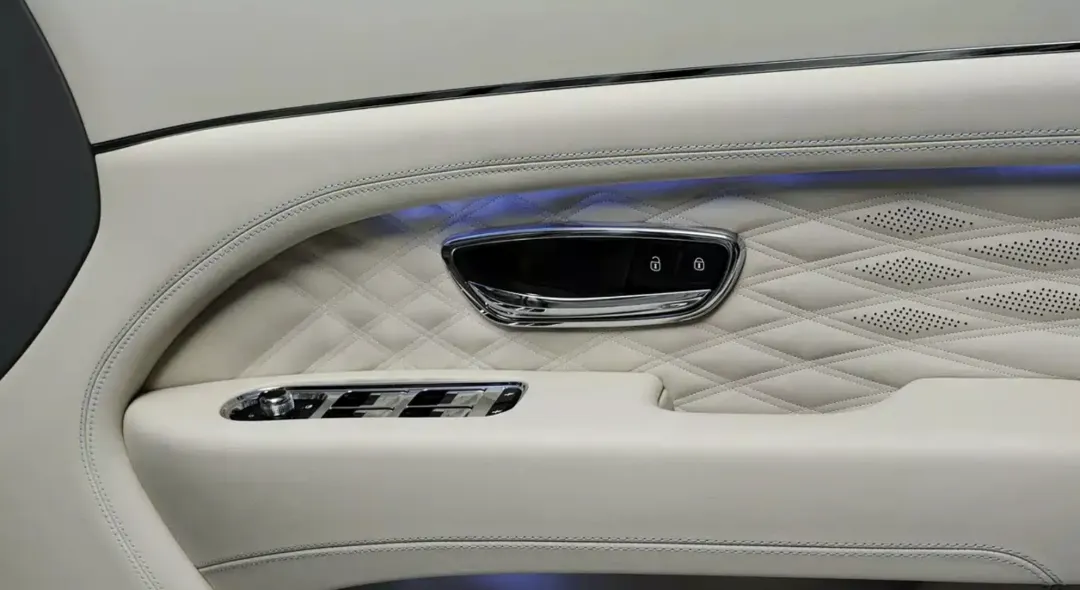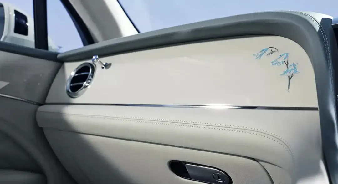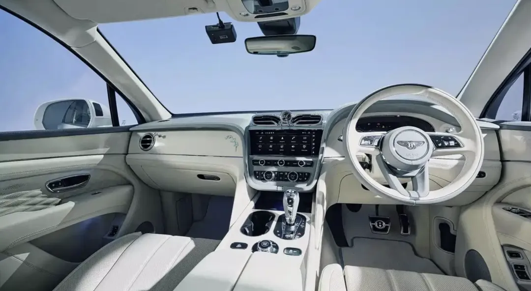 这台限量版的宾利添越Something Blue车内采用了大面积米白色的高档真皮材质铺陈,环抱式座舱四周加入了蓝色的花朵图案,整个内饰也以浅色系的皮革搭配,迎宾踏板上也会有Something Blue Collection的专属铭牌。科技感方面却与现款在售的宾利添越保持一致,标配了12.3英寸的全液晶仪表盘,带有10.9英寸的高清触控中控屏,操作流畅,支持Apple CarPlay和Android Auto手机互联,实现无缝的数字生态接入。还有HUD抬头显示系统,科技感与时俱进。车机采用了My Bentley App Studio。还配备了宾利Signature或顶级Naim for Bentley 20扬声器音响系统,提供殿堂级的听觉享受。