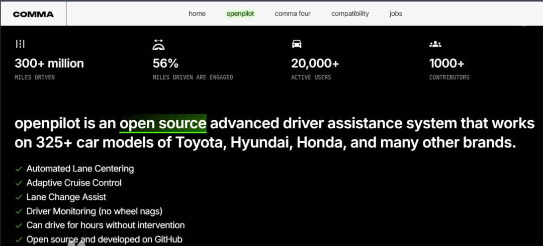 先说一下oenpilot。这个就是后装(改装车)用的,普通汽车用户只需要加装兼容硬件,即可配合 Openpilot,实现“自动驾驶”。该软件是开源的,目前支持市面上325+的车型。值得注意的是,该开源项目更多出于“实验”目的。用户完全依靠该自动驾驶软件,会有一定风险。而且出了任何事故,都需要车主自己去负责。