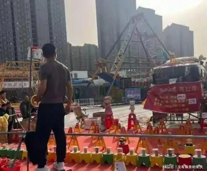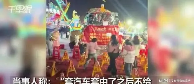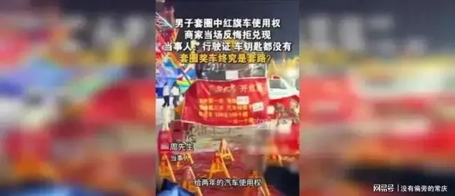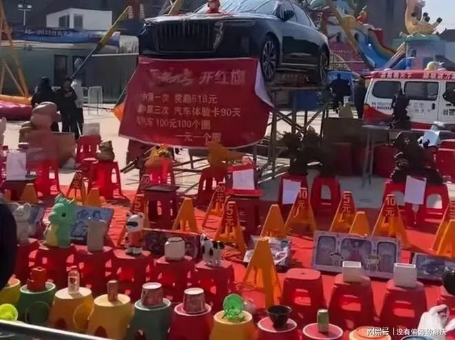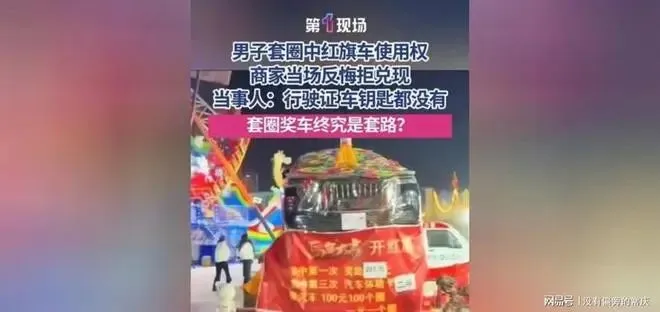 这个事发生在济宁一个景区里, 有个叫,幸运套圈, 的摊位, 旁边摆着一辆锃光瓦亮的红旗H5轿车, 看着特别真, 牌照都焊死了, 油箱盖子也能拧开, 钥匙孔里还插着一把黄铜钥匙, 摊位前的横幅也写得明明白白, 套中真车, 当场开走, 看着就让人心动。