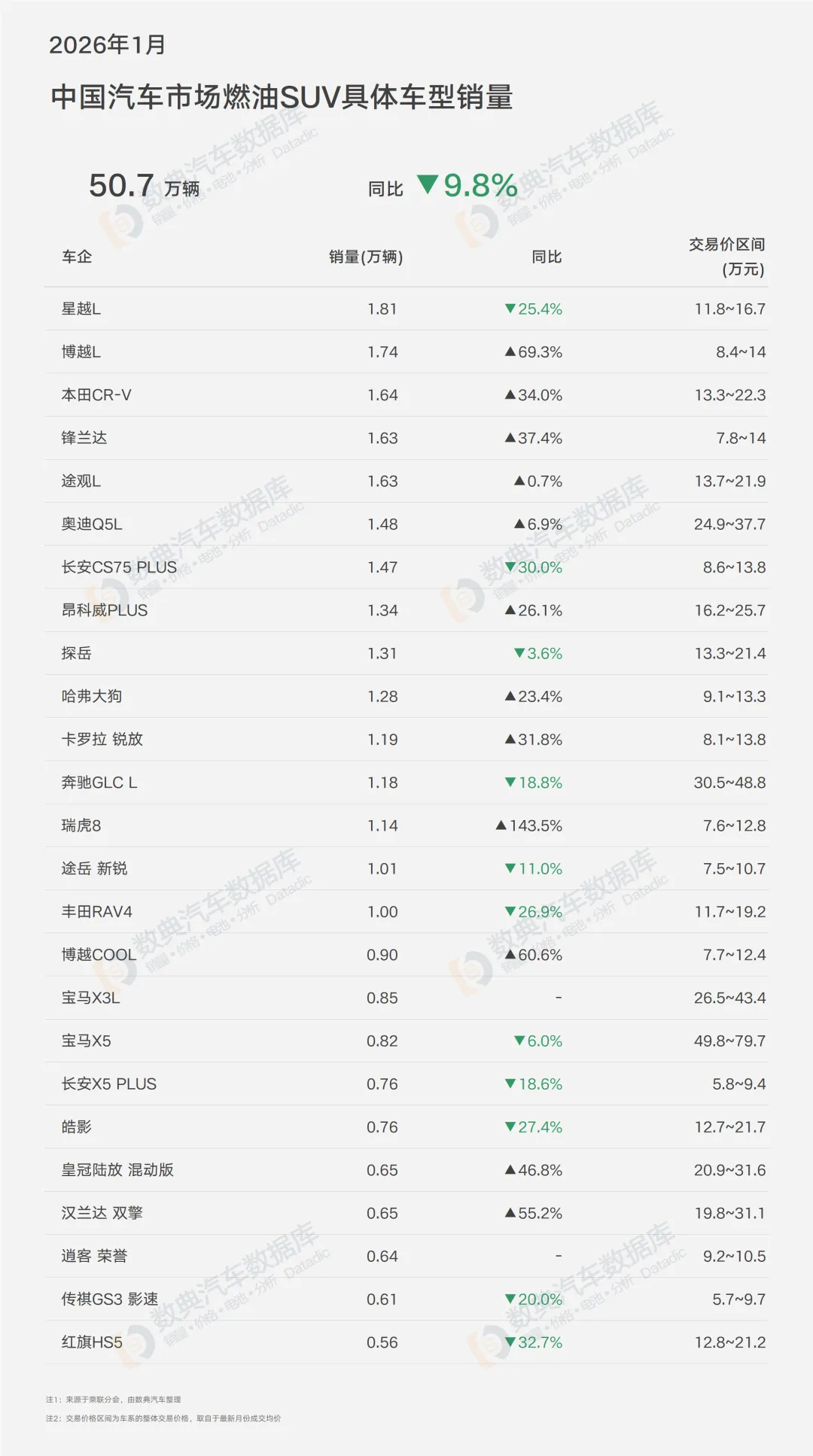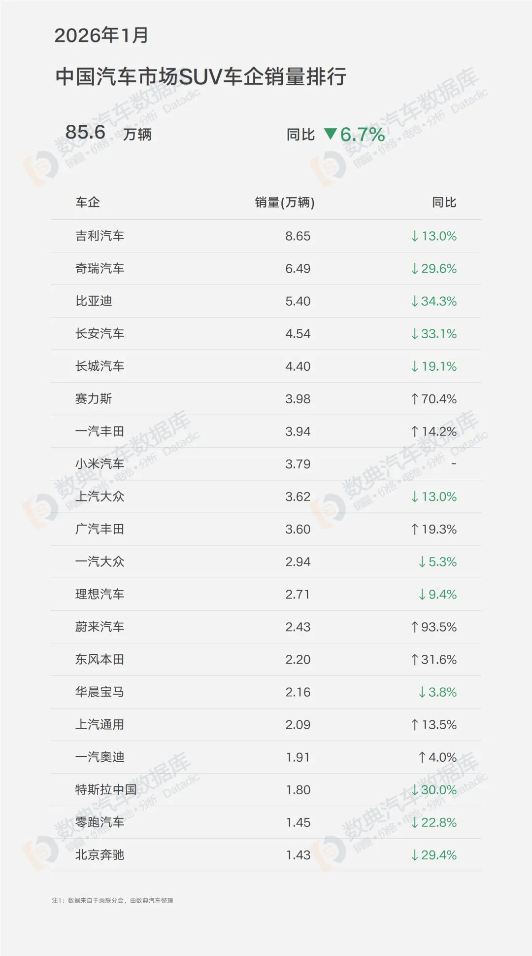 2026年开年,中国汽车市场交出了一份略显沉重的成绩单:整体销量156.3万辆,同比大幅下滑15.1%。在这个凛冽的寒冬里,SUV市场以85.6万辆、同比下降6.7%的表现,显著跑赢大盘,市场份额进一步提升至54.8%,稳居半壁江山。