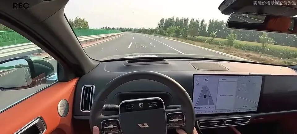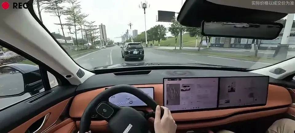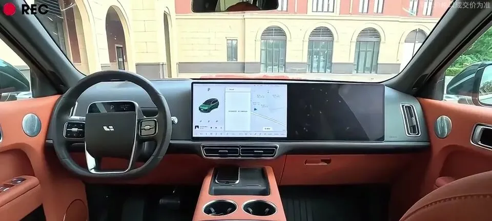 理想L8汽车的驾驶舱,棕色内饰,双屏设计