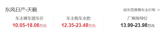 首先是价格,26款日产新天籁的厂家指导价为13.99-23.98万元,在终端已经有着1万元的现金优惠幅度。而且我们发现叠加上补贴,不少用户购买到的裸车价甚至连11万都不到,所以说这是一款价格亲民的中级燃油车。