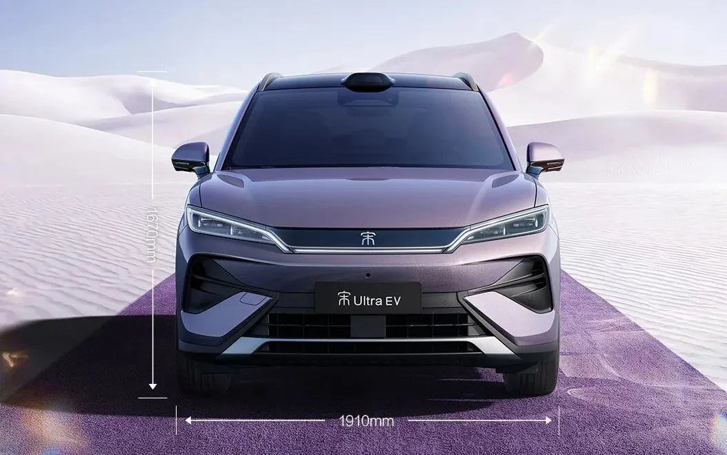外观方面,宋Ultra EV延续王朝龙颜纯电设计,封闭式前脸配U型饰板衔接纤细LED大灯,侧部黑化悬浮车顶+隐藏式门把手,线条舒展修长。车尾贯穿式OLED尾灯搭配敦实后包围,烟岚紫等车色,兼顾东方美学与都市科技感。