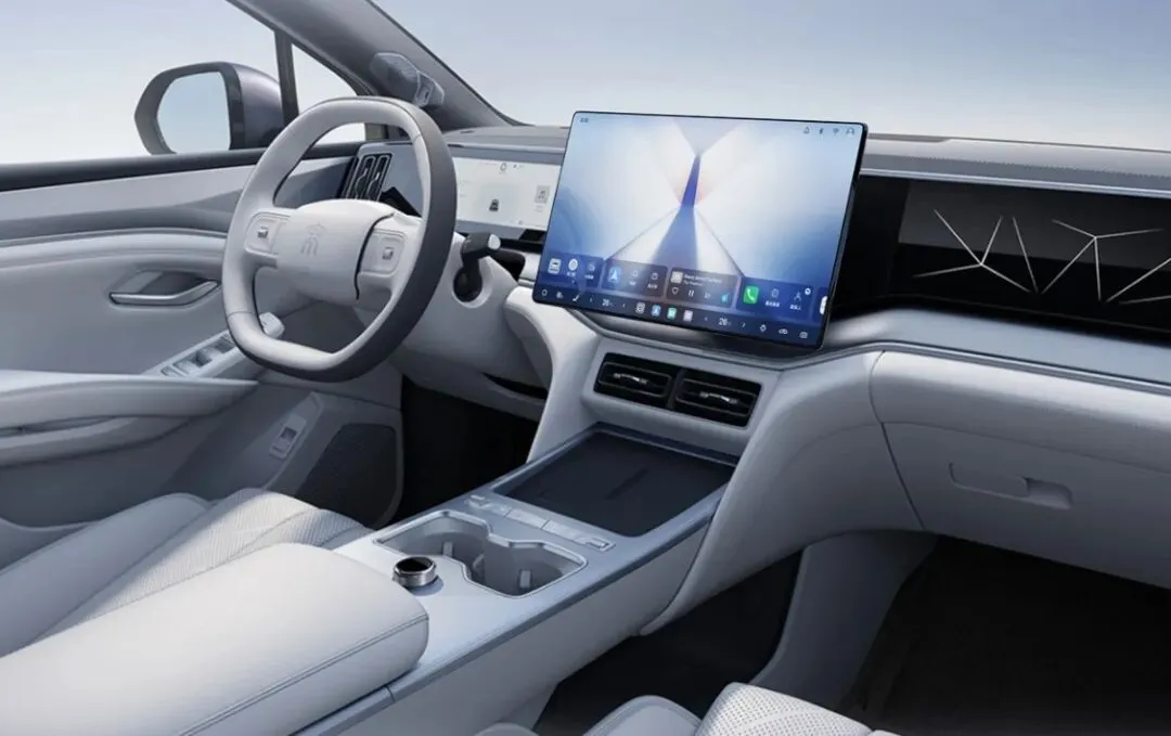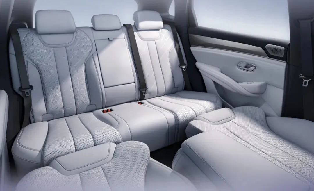内饰方面,采用平直舒展的中控台线条,内嵌式全液晶仪表搭配悬浮式大尺寸中控屏,双辐式多功能方向盘握感扎实;中控扶手区标配双50W无线快充、双杯架与多媒体控制旋钮,副驾前方饰板加入精致几何纹理,提升座舱高级感。