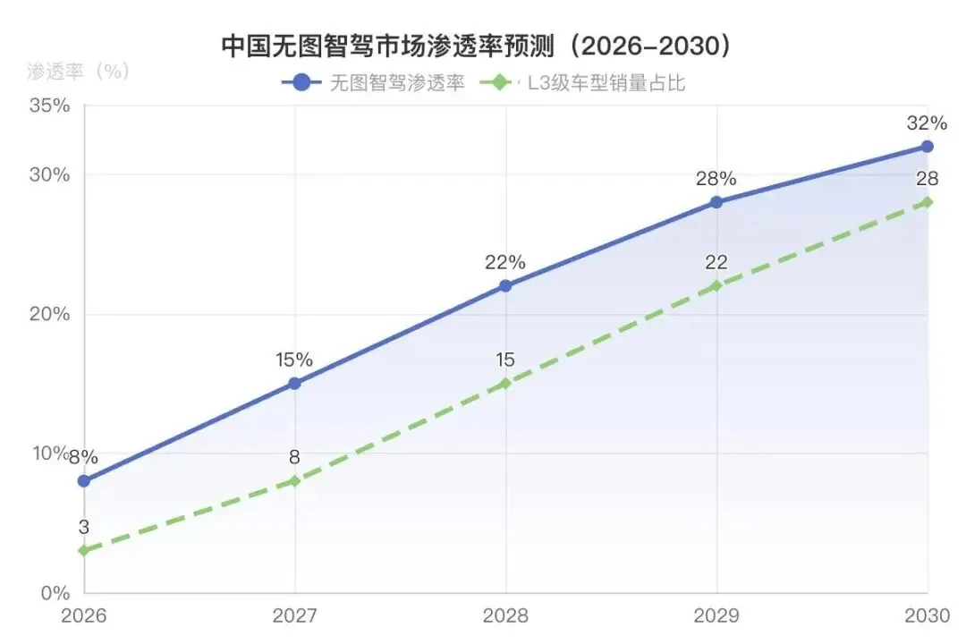 行业预测显示,2026年中国无图智驾渗透率将达到8%,主要覆盖20-50万元价位车型;2027年渗透率提升至15%,开始下探至15万元级市场。这意味着,两年后购买一辆搭载无图智驾功能的汽车,将不再需要承担过高溢价。