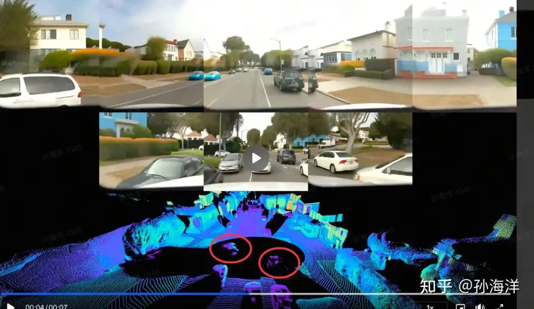 Waymo Driver 规避一辆逆行车辆的仿真示例。该仿真最初基于一次真实事件展开,并无缝过渡到由高效实时的 Waymo World Model 自动生成的摄像头与激光雷达图像。