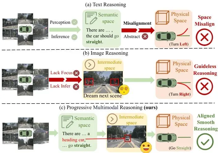 要理解MindDriver的巧妙,得先看看它要解决什么问题。论文里这张对比图非常直观:图1:不同推理方法的对比。文本推理存在空间错位,图像推理缺乏引导,本文提出的渐进式多模态推理实现了平滑对齐的推理。