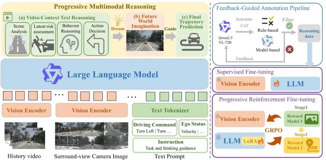 这篇论文提出了一种非常符合人类直觉的自动驾驶推理范式,将“思维链”从纯文本扩展到了“文本-图像-轨迹”的渐进式多模态过程。它不仅思路清晰,更重要的是配套了自动数据标注和渐进式强化学习两大“工程利器”,让想法真正落地并取得了SOTA效果。对于想了解如何将大模型能力与具体自动驾驶任务深度结合的研究者和工程师来说,极具参考价值。
