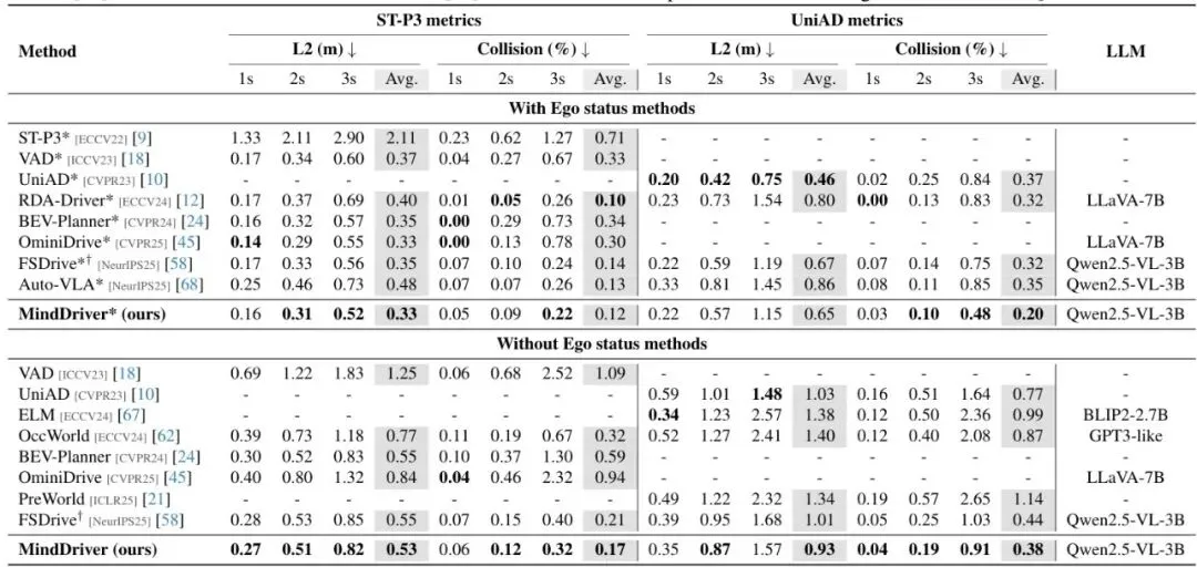 下表是在nuScenes数据集上的轨迹规划结果,对比了众多SOTA方法,包括传统端到端模型(如UniAD, VAD)和基于VLM的方法(如FSDrive, AutoVLA)。指标是L2位移误差(越低越好)和碰撞率(越低越好)。表1:在nuScenes数据集上的端到端轨迹规划实验。我们基于ST-P3和UniAD两种不同的计算方法评估了L2和碰撞指标。*表示额外使用了自车状态。†表示使用Qwen2.5-VL-3B官方代码重新实现的结果。