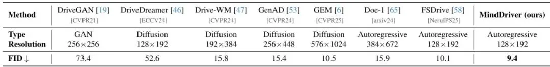 作为中间步骤,生成的未来图像质量也很高。使用FID(弗雷歇起始距离,越低越好)指标衡量,MindDriver生成的图像清晰度和合理性超过了包括DriveDreamer、GenAD在内的专业未来帧生成模型,达到了SOTA。表2:在nuScenes数据集上的未来帧生成结果。