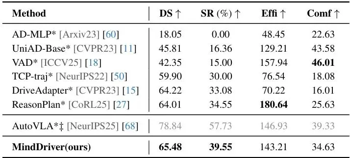 开环测试好比“看图说话”,闭环测试则是真的把模型放进模拟器里“开车”,考验其与环境的实时交互和长期决策能力。在Bench2Drive上,MindDriver也表现优异,综合驾驶分数(DS)和成功率(SR)显著高于许多传统方法,与最强的VLM基线之一AutoVLA相比也各有千秋,并在成功率上展现出优势。表3:在Bench2Drive(CARLA)基准上的闭环结果。*:额外使用了自车状态。†:未在Bench2Drive训练集上训练。