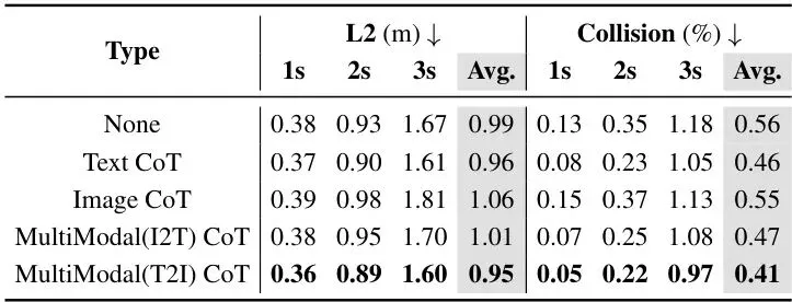1. 纯文本CoT的“纸上谈兵”问题:传统的CoT让模型输出一段文本分析,比如“前方有车,减速,准备向右微调”。这分析本身可能很合理,但模型接下来要直接从这段文字跳转到预测一条精确的物理空间轨迹(由一串坐标点组成)。这中间存在巨大的语义空间与物理空间的鸿沟。“向右微调”到底是调多少米?模型很难把握,导致决策不准。