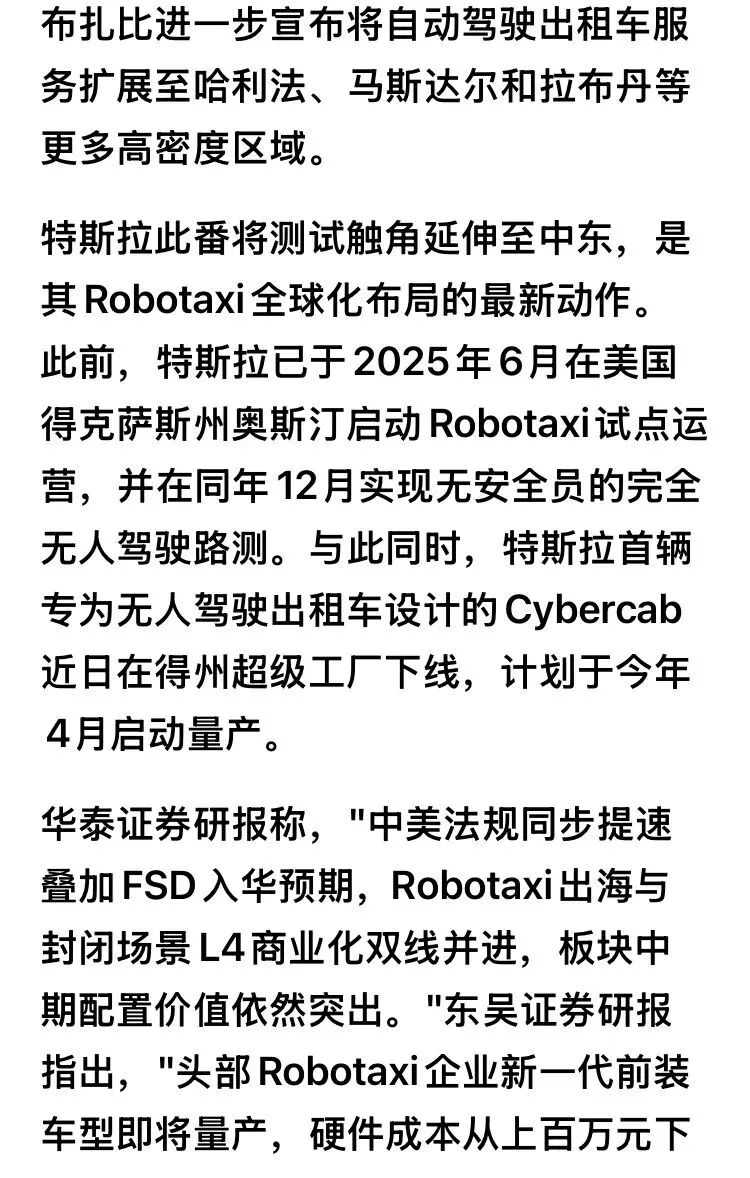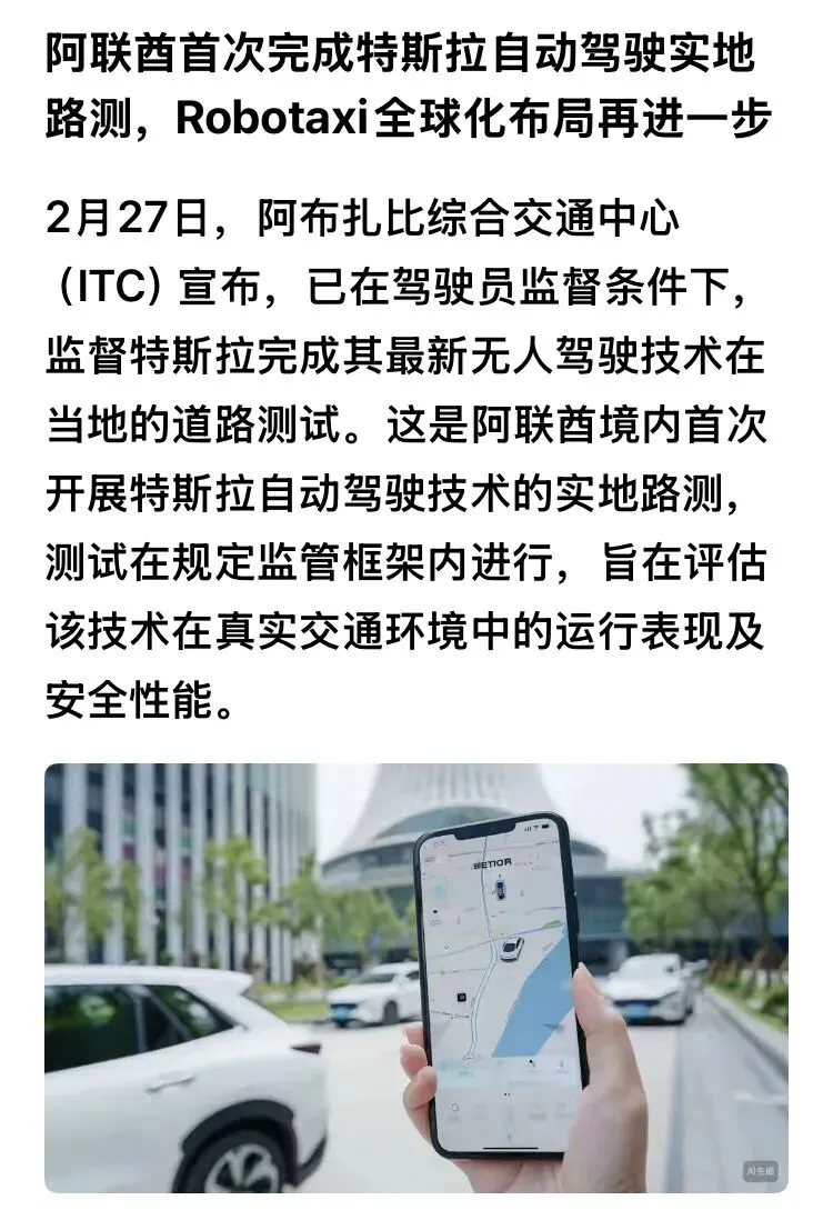 >阿联酋首次完成特斯拉自动驾驶实地路测,Robotaxi全球化布局再进一步!