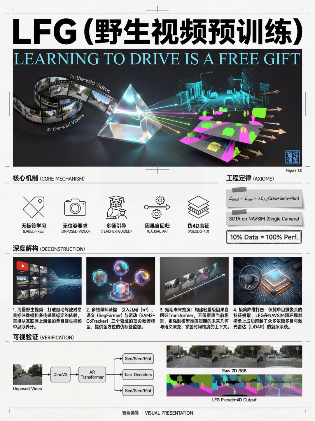 LFG提出了一种无需标签的自动驾驶预训练框架,通过单视角未标注驾驶视频学习统一的几何、语义和运动感知的伪4D表示,在规划任务中超越了多相机和LiDAR基线。