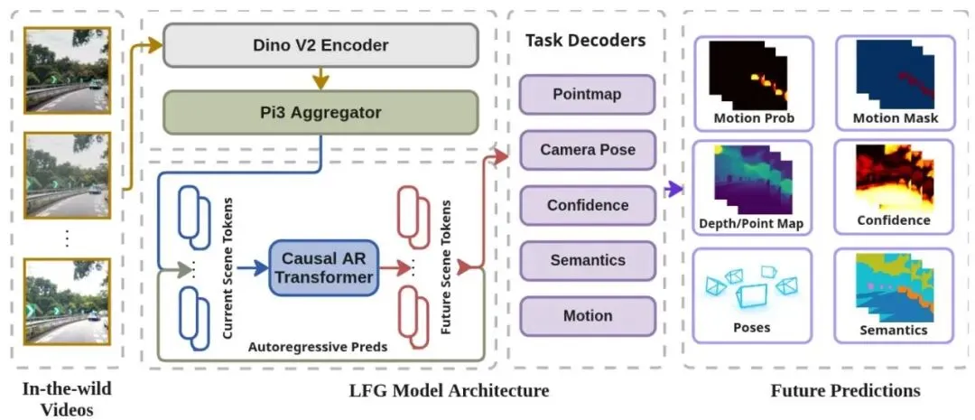 LFG通过预训练编码器和因果自回归Transformer对现实世界视频进行处理,联合预测当前和短期未来场景的几何结构、语义信息以及运动状态。首先,模型应该预测随时间变化的自车视角相机的点图 ,其中 , 将图像 中的每个像素映射到 ,即时间 时像素 y 对应的3D世界点。