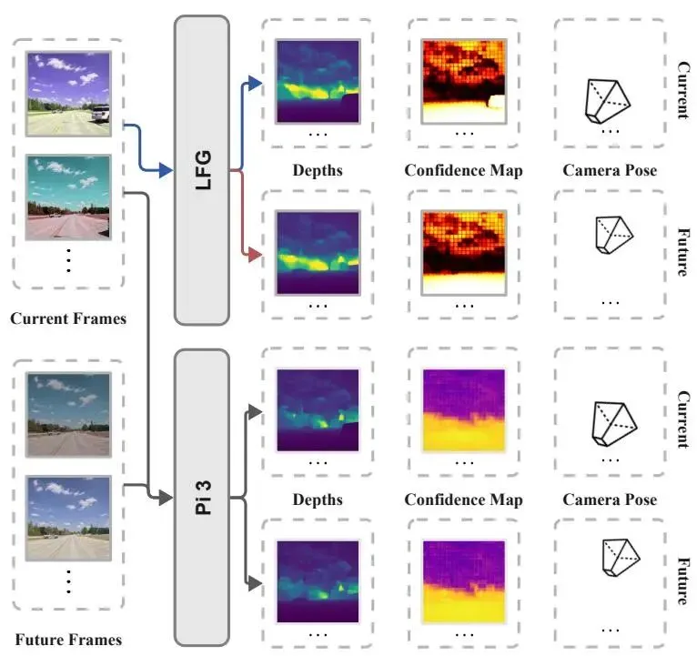 图3. 到LFG的知识蒸馏。本文通过监督所有观测帧和未来帧的点图、置信度图和相机姿态,将从预训练的 教师模型中迁移几何知识给LFG。虽然教师模型可以访问完整序列,但学生模型只能看到前 帧,并必须同时预测当前和未来的几何结构,从而使得LFG能够从部分观测中学习时间一致的场景结构和未来自运动。