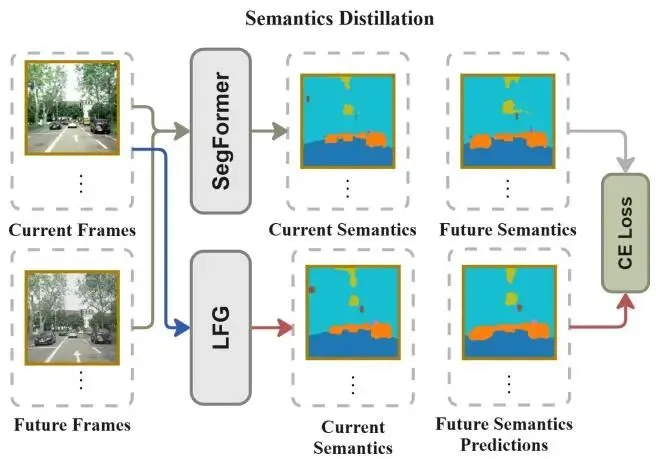 图4. 语义蒸馏。在Cityscapes上预训练的SegFormer教师模型为每一帧提供软语义伪标签。LFG仅使用前个输入,预测观察到和未来帧的语义图,通过与模型几何特征对齐的教师-学生监督学习时间一致的场景语义。